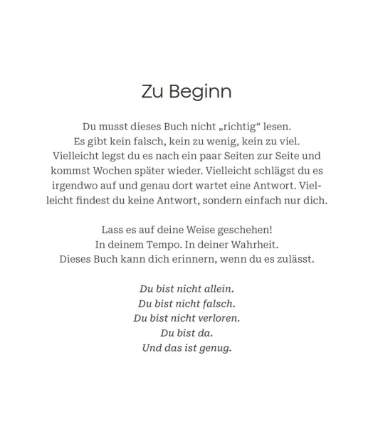 Dieses Buch ist kein Ratgeber, keine (weitere) Methode, die du erlernen sollst, keine Anleitung, wie du anders werden sollst.